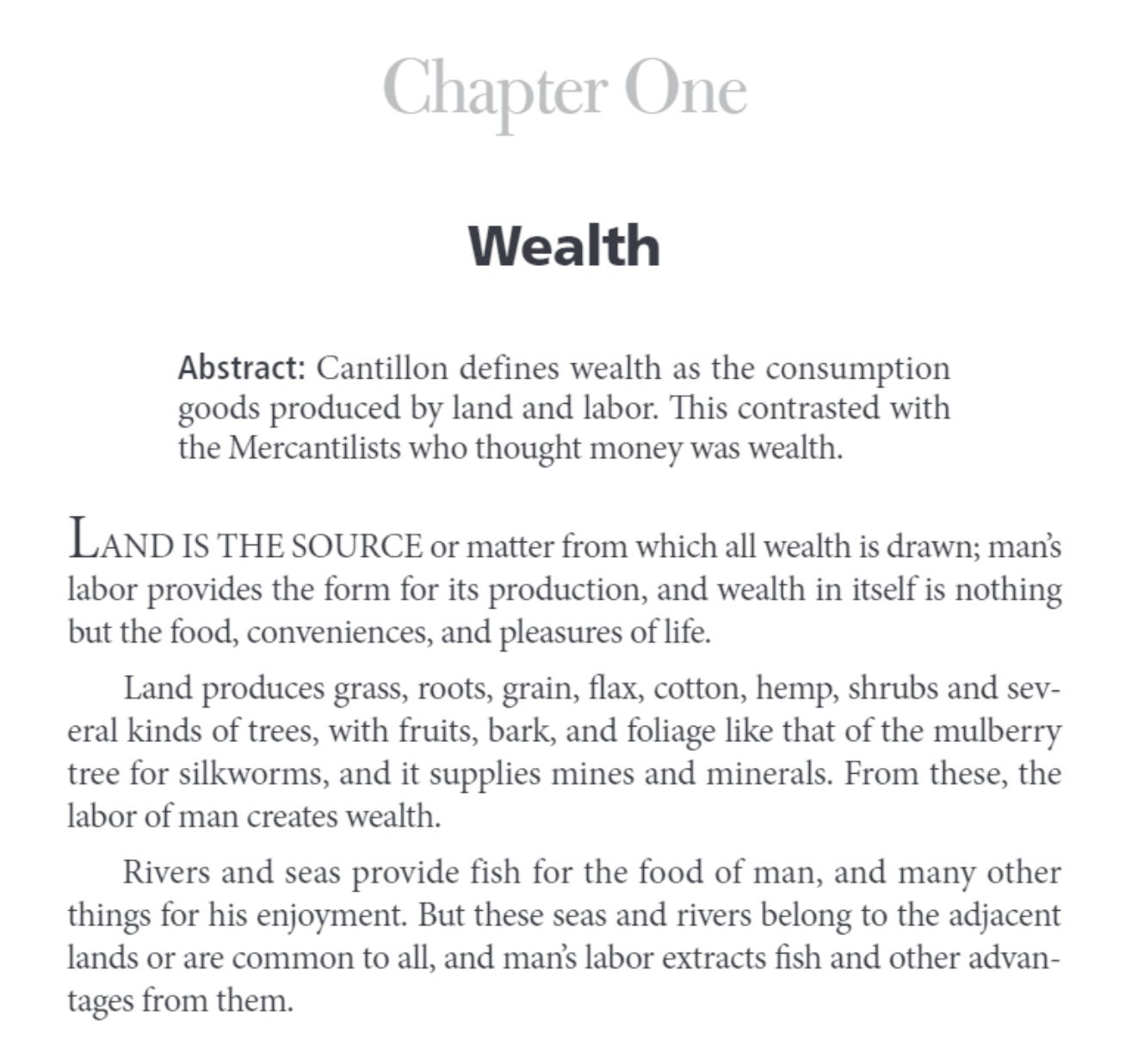 The position of the husbandman is materially different. The soil, independent of any other man, or of any agreement, pays him directly the price of his toil. Nature does not bargain with him to compel him to content himself with what is absolutely necessary. What she grants is neither related to his wants, nor a contractual valuation of the price of his days of work. It is the physical result of the fertility of the soil, and of the wisdom, far more than the laboriousness, of the means which he has employed to render it fruitful. As soon as the labor of the husbandman produces more than his wants, he can, with the surplus which nature accords him as a pure gift above the wages of his toil, purchase the labor of other members of society. The latter, in selling to him, only obtain a livelihood; but the husbandman, besides his subsistence, collects an independent and disposable wealth, which he has not purchased and which he sells. He is, therefore, the unique source of the wealth which, by its circulation, animates all the industry of society, because he is the only one whose labor produces more than the wages of his labor. — Turgot